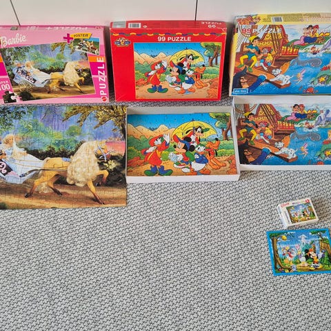 Børnepuslespil med maks. 40 brikker. 12 puslespil i god stand. Der mangles én brik og én æske mangler ét puslespil (den med bamse og kylling).