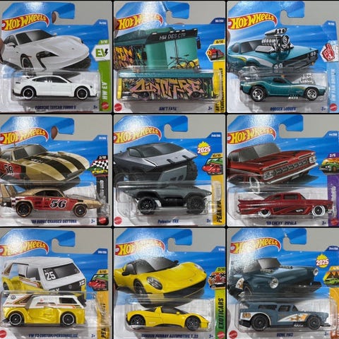 Hot Wheels legetøjsbiler i forskellige størrelser og designs. Sættet indeholder flere biler med forskellige farver og former, velegnet til børn.