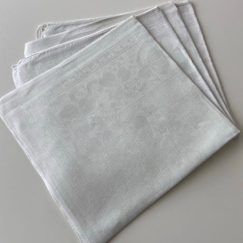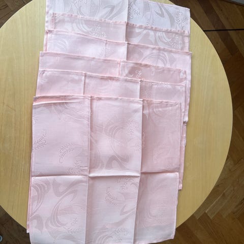 Jeg mener, det er damask. De seks servietter har været vasket og strøget, men ikke brugt. De er i superfin stand. Farven er laksefarvet og mest som på det sidste billede, der dog viser de seks andre mundservietter i samme stof, som jeg også har til salg.