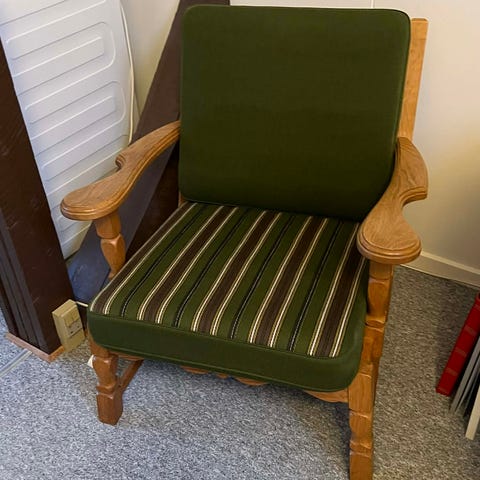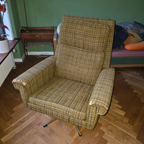 Stolen er fundet på storskrald for 1000 år siden. Sidder fast i den tilbagelænede position.