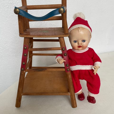 GAMMEL DUKKE IKLÆDT FELIN BABYDRAGT. HUN HAR ÅBEN MUND TIL SUT OG RANGLE VED HÅNDEN