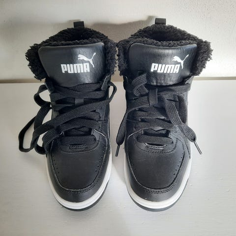 Puma børnesko til dreng i størrelse 37. Skoene er sorte og har en høj model med snørebånd. Sålene har mønster for bedre greb. Indersiden er være foret for ekstra komfort.
