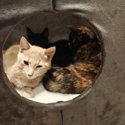 Der medfølger, et lille kradse træ, tørfoder, lidt vådfoder. Mad og vandskål.
