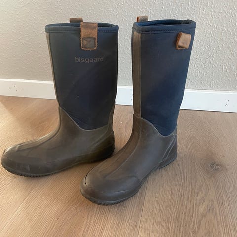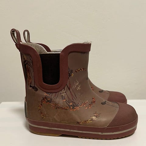 Bisgaard termostøvler til pige i størrelse 32. Støvlerne har et mønster med grene og blade på en lys baggrund og en brun kant øverst. Designet til at holde fødderne varme og tørre i vådt vejr.