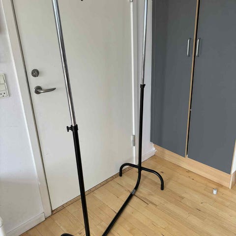 Justerbar i højden - 147 cm som det højeste. Med en 30 cm “arm” i hver side som kan trækkes ud.