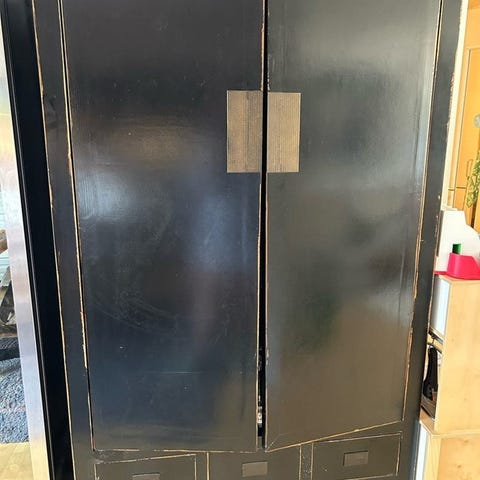 Sort vitrineskab i massivt træ med hylder og skuffer. Kan skilles ad bagpå til en kommode og en hængevitrine. Afhentes i stueetagen 😊