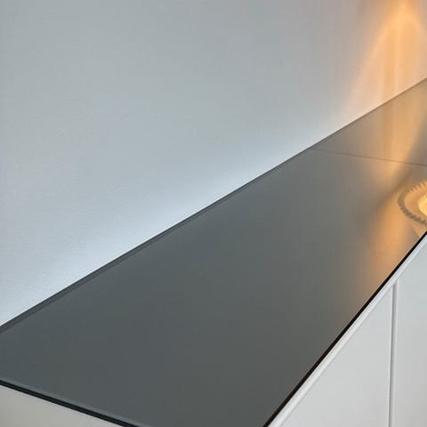 Måler 83 x 38 x 1 cm. Er glas på den ene side (opad) og mat/ru på den anden side.