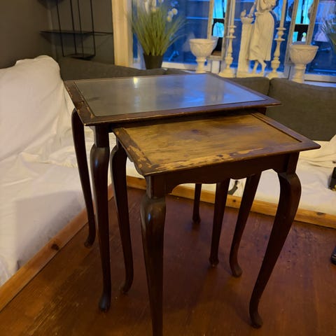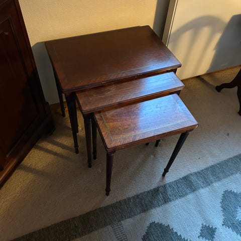 Sæt af tre nesting borde med fliseplader i toppen og trærammer. Bordene har dekorative fliser med blomster- og bladmotiver. Designet til at kunne stables under hinanden for pladsbesparelse.