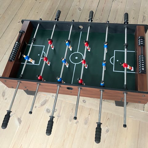 Bordfodboldbord med træfinish, metalstænger og plastikspillere i blå og rød. Bordet har scoretællere og ben i sort.