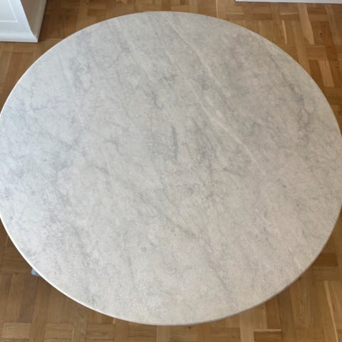 Jørgen Høj designede i 1962 dette runde spisebord med plade i en smuk hvid / grå meleret marmor. Rundt om marmorpladen er der 4 skiver der tilsammen danner en ring der øger diameteren på bordet. Forlængelsespladerne er i olieret eg og stellet er i børstet stål. Bordet er i fin stand. Bordet minder på mange måder om Poul Kjærholms PK54 hvilket ikke er mærkeligt da de to arkitekter arbejde sammen af nogen omgange.