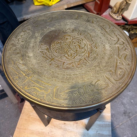 Exceptionelt 1 stk Kønt sÌrligt i sollys, fremstür mørkere i skygge (se begge scenario). Semiantikt rundt trÌbord. Jagtscenario. Rigt detaljeret, punslet, udstanset, mønster m. Elefanter, Kameler, Heste, Ryttere + antageligt Sanskrit, indisk püskrift. Det er IKKE et bakkebord.