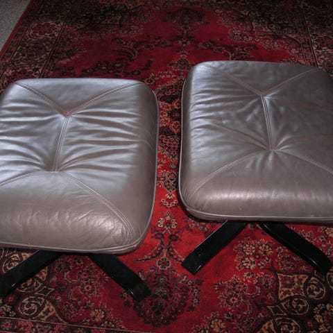 2 ens fodskamler i mørkebrun kunstlæder med flotte formspændte træben.