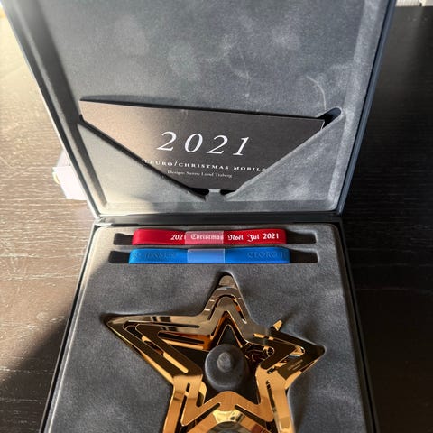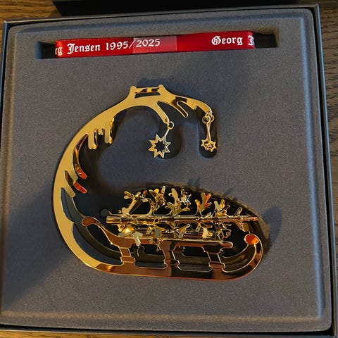 Georg Jensen Christmas Collectible Stjerne ornament i guld. Fremstillet i metal med en guld finish. Inkluderer en rød og en blå bånd med teksten '2021 Christmas' og 'Jul 2021'. Leveres i en original opbevaringsæske med Georg Jensen logo. Aldrig været hængt op og kun taget ud for at tage billeder - fra ikke ryger hjem - med original kasse og pap omslag og med to bånd. Kan sendes for 47 kr.