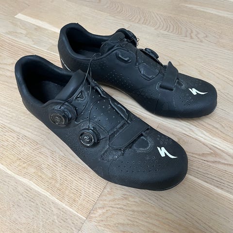 Specialized S-Works Road cykelsko i størrelse 43. Skoene er designet til landevejscykling og har en lukningsmekanisme med drejeskive for præcis pasform. Farven er rød med detaljer i hvid.