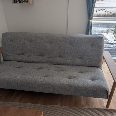 Super sovesofa til teenage- eller gæsteværelse. Praktisk og pænt gråt stof uden pletter eller slitage. Opbevaringsrum under stellet. 2 indstillinger til sofaryggen. Madras kan afmonters stel ved transport.