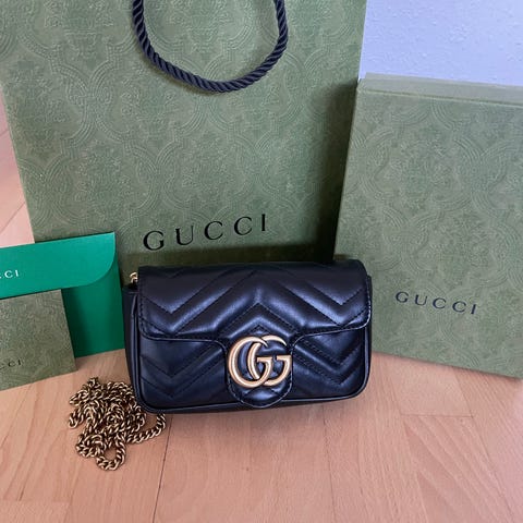 Gucci læder taske med dekorative nitter og detaljer i guld. Tasken har to håndtag og en aftagelig skulderrem med nitter. Inkluderer Gucci-stofpose og tilbehør med hjerteformede vedhæng.
