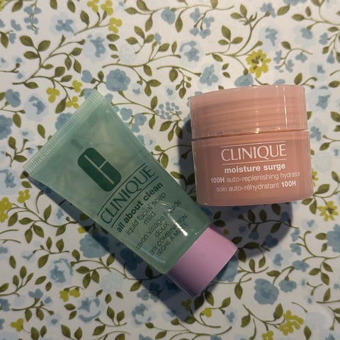 Clinique rens vask sæbe og creme. Rejsestørrelser. Helt Nyt. 30 ml moisture surge 100H auto-replenishing hydrator. 30 ml all about clean 2-in-1 cleansing + exfoliating jelly.
