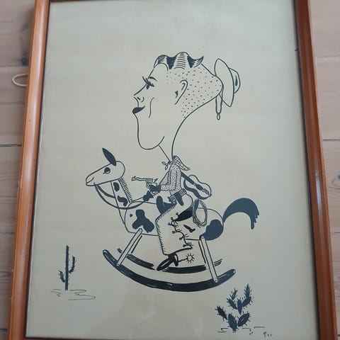 Original karikaturtegning af Poul Reumert. Blæk på papir. Signeret "Roald". I sort træramme. Rammemål: 40 x 30,5. Tegning: 29 x 22,5. Sender gerne. kan også afhentes i Odense SØ.