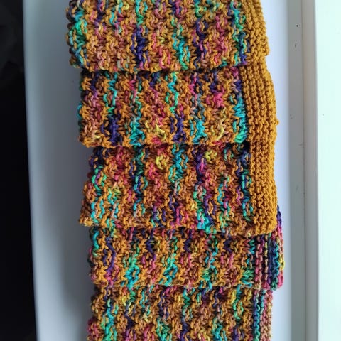 7 STK. KARKLUDE STRIKKET I 100 % BOMULDSGARN MED FARVERNE BLÅ/GRÅ/TURKIS - MÅL: CA. 25 X 26 CM. - VASK VED 60 GRADER - 10,- KR. PR. STK. - FAST PRIS - SENDES MED DAO