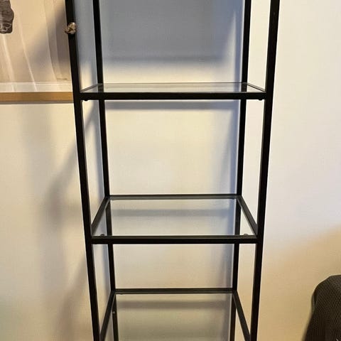 IKEA reol og skrivebord i sort/brun metal og glas. Sættet trænger til en god glasrens, men er ellers i fin stand uden markante ridser eller skader. Glassene har lidt brugspor her og der, men ikke noget iøjenfaldende.