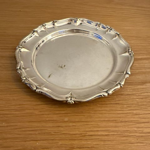 Lille kønt sølvplet fad, glas/flaske bakke, med vindrue ranker rundt i kanten og ciseleringer på midten,