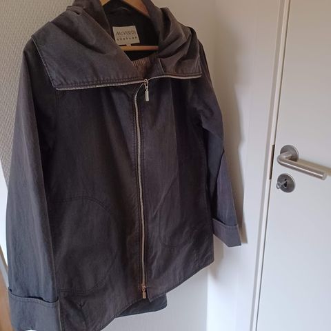 Lys grå jakke med asymmetrisk lukning (lynlås), høj krave og lommer.