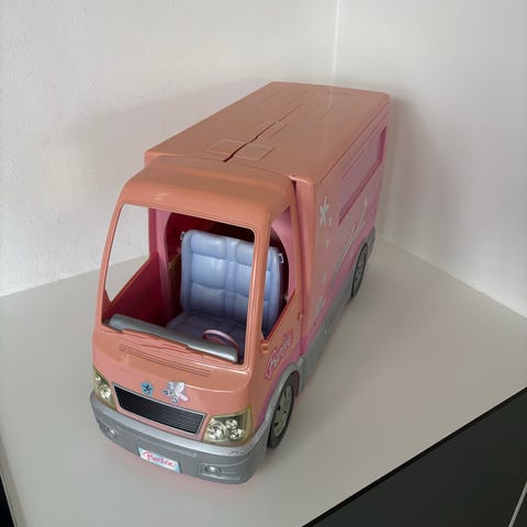 Barbie legetøjslastbil i lilla og pink farver med åbne sider og detaljer som madillustrationer. Egnet til børn til rolleleg og kreativ leg.