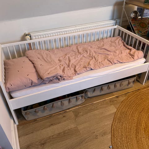 Brugt men i god stand. Sengen har en revne, der er limet og har holdt til to børn.