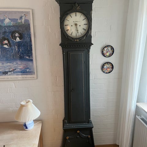 Bornholmerur med rund urskive, dekorative detaljer og træfinish. Uret har en klassisk stil med et tydeligt urskive og viser. Der er et årstal 1864 markeret på bagsiden af urskiven.