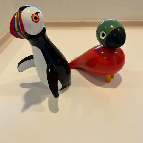 Jeg sælger mine 3 kay Bojesen søpapegøjer der alle 3 er i super flot stand, der er den lille jubilæums udgave, den almindelige Rosendahl og så er den store nummererede lavet i 250 eksemplarer i anledning af 70 års jubilæet, jeg sender ikke sælges kun samlet så prisen er for alle 3.