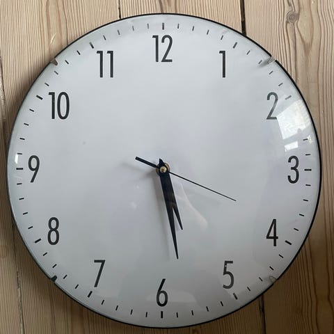 Uret har romertal som timeangivelser og visere i messing-lignende materiale. Der er et batteridrevet urværk på bagsiden.