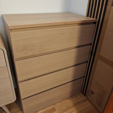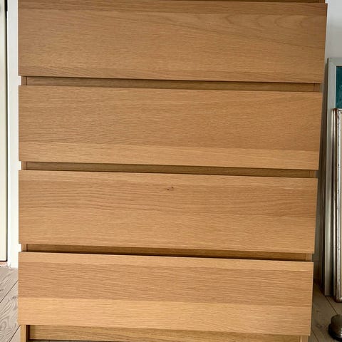 Kommode (Malm fra Ikea) i egetræsfiner og med 6 skuffer.