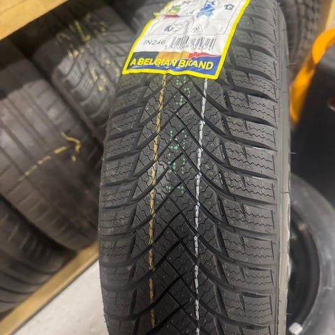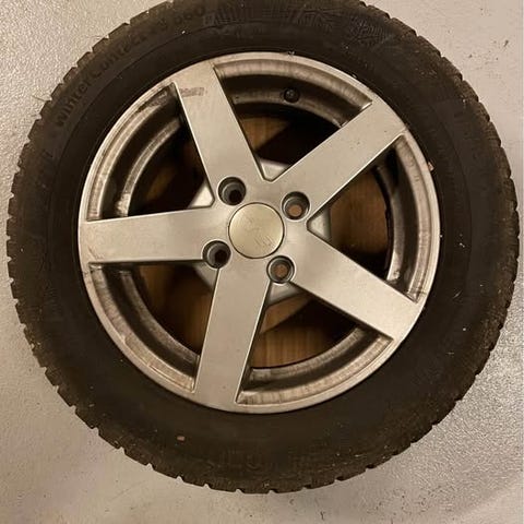 4 st Hankook vinterdæk med fælge ( 165 / 65 R14 ) og hjulkapsler fra Biltema. Mønstertykkelse: 8 mm
