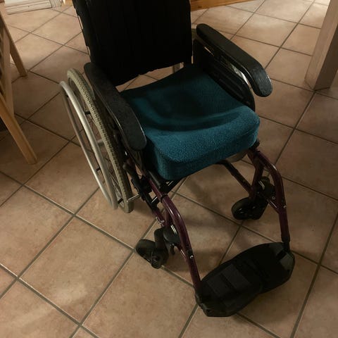 Sort kørestol med armlæn og fodstøtter