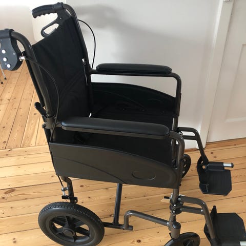 Sort kørestol med armlæn og fodstøtter. Kørestolen har en let ramme og polstret sæde og rygstøtte. Den er designet til indendørs og udendørs brug og kan foldes sammen for nem transport og opbevaring. Fylder ca 70 x 100 cm når den er klappet sammen.