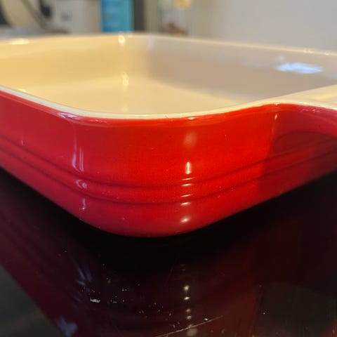 Le Creuset ovnfast fad i keramisk materiale. Fadet har en rektangulær form med en glat, lys indvendig overflade og en rød yderside. Velegnet til bagning og tilberedning i ovn, det er 5,5 cm højt, 27x 18 cm.