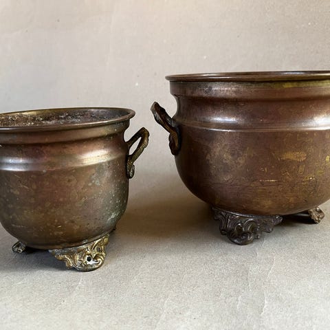 Dekorativt vintage urtepotteskjuler-sæt i 3 dele i hammerslået messing.