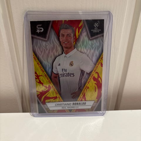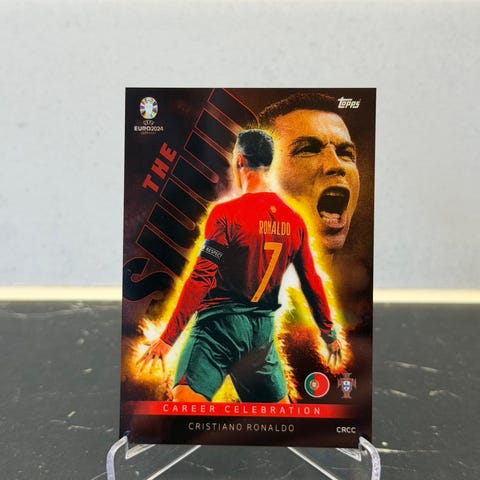 Topps The Summit Cristiano Ronaldo samlekort med motiv af Cristiano Ronaldo i portugisisk landsholdstrøje. Kortet fejrer Ronaldos karriere og internationale titler, herunder UEFA European Championship og FIFA World Cup deltagelser. Kortet er indkapslet i en beskyttende plastkapsel.