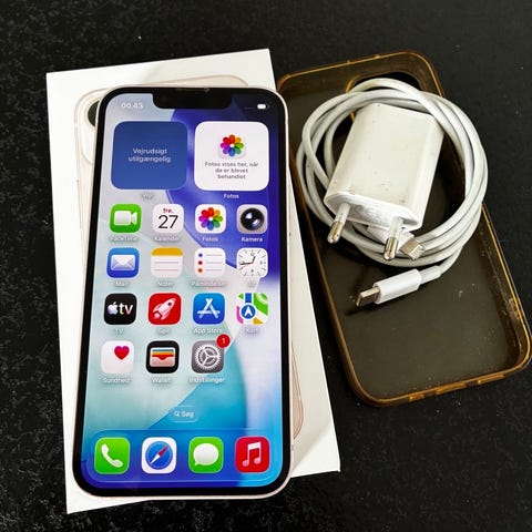 Apple iPhone 13 med 128 GB lagerplads i lyserød farve. Telefonen fungerer perfekt og fejler ingenting.