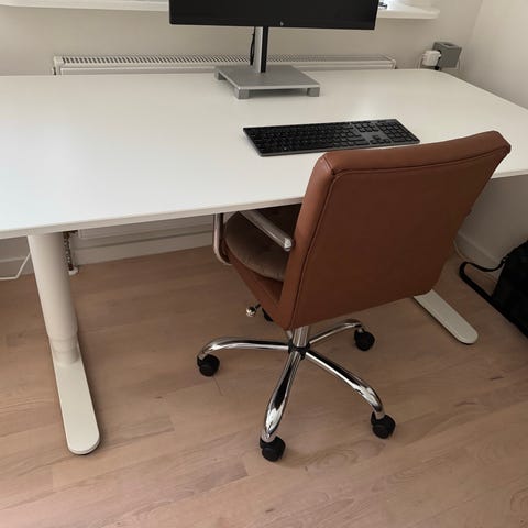 IKEA Bekant hvidt hæve-sænkebord. Velfungerende og pænt med få ridser på bordets fødder efter støvsuger. Net under bordpladen til at indeholde ledninger og strømforsyninger til f.eks skærm. Virker 100%. Afhentes i Stenløse. Er ikke skilt ad endnu og kan derfor afprøves. Købspris: 2.949 kr