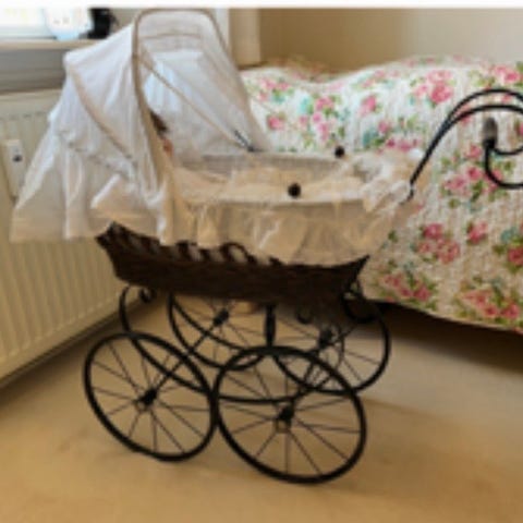 Vintage dukkevogn med beige stof og metalramme