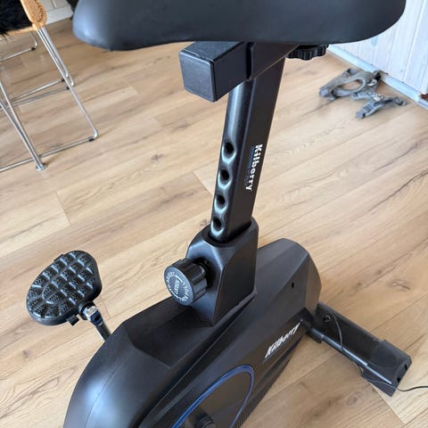Justerbart sæde. Pulsmåler i styret. Baggrundsbelyst display der viser tid, hastighed, distance, kalorier og belastning/program.