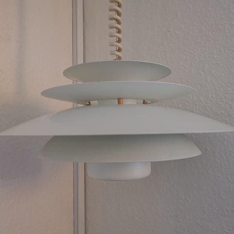 Form-Light pendellampe, model 52700, hvid og blå. Ø48. Lampen har et karakteristisk design med flere skærme, der sikrer blændfri belysning. Velegnet til ophængning i loftet for generel belysning i rum eller over spisebord. Sælges uden ledning og lyskilde. Velholdt og virker som den skal.