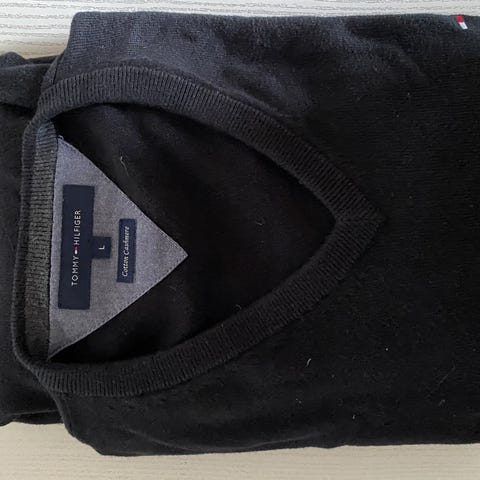 Rigtig pæn pullover med V-hals, er sort med hvid/grå striber i forstykket.