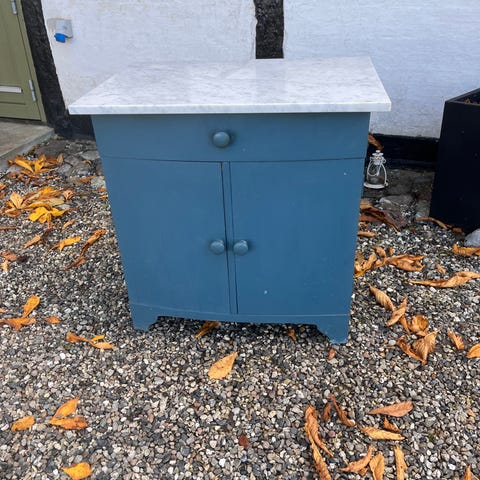 Kommode/ skab i god stand med marmor plade på toppen. H. 76. cm B. 63 cm D. 34,6 cm.