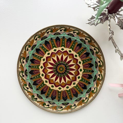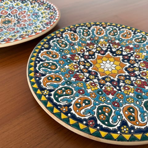 Pladerne har et dekorativt mønster i farverne blå, grøn og beige. Bagsiden af pladerne har ophæng til vægmontering. Velegnet til dekoration af vægge.