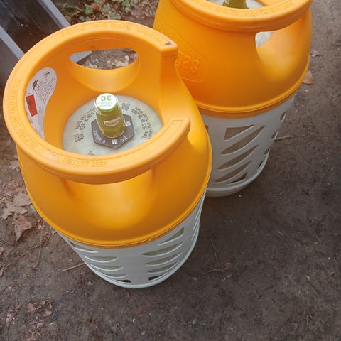 2 stk 10 kg letvægts gasflasker med gas. Der er 8,5 kg i den gule, og 4,5 kg i den anden.