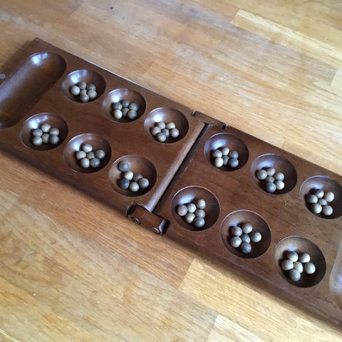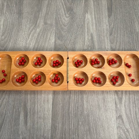 TIGER Kalaha spil med blå spilleplade og røde kugler (komplet og med 11 ekstra kugler. Spillet består af en rektangulær plade med fordybninger til kuglerne, designet til to spillere. Æsken er i meget solid stand og kvalitet.