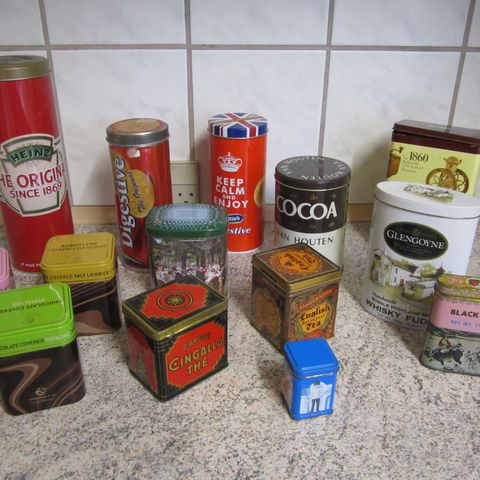 Fra Twinings: 2 dåser seks kantede 7,5 x 7 cm. Pris 20 kr. stk.