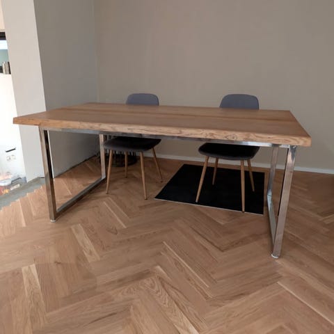 Egetræsplankebord med naturkant og stolben i matsort.
